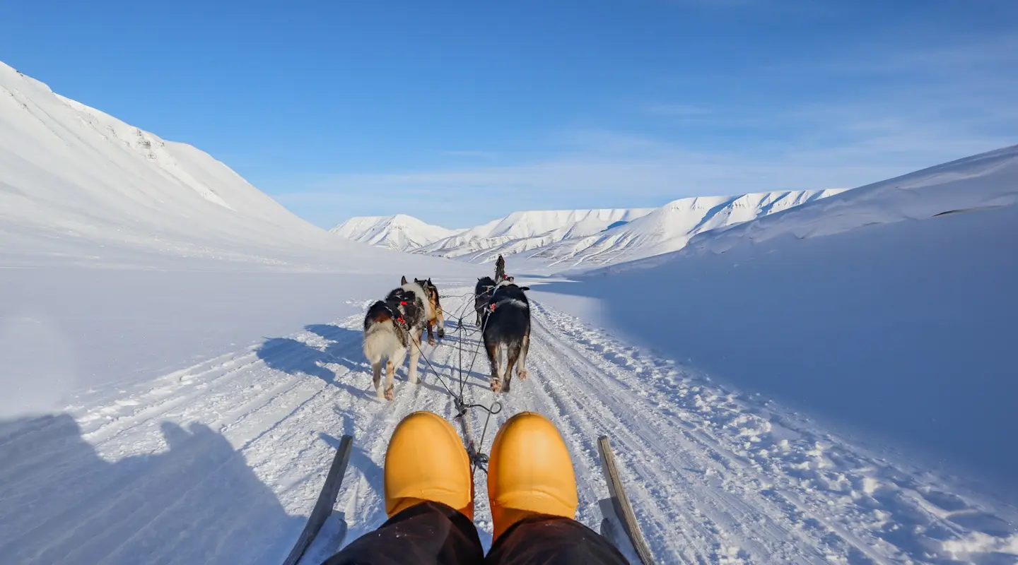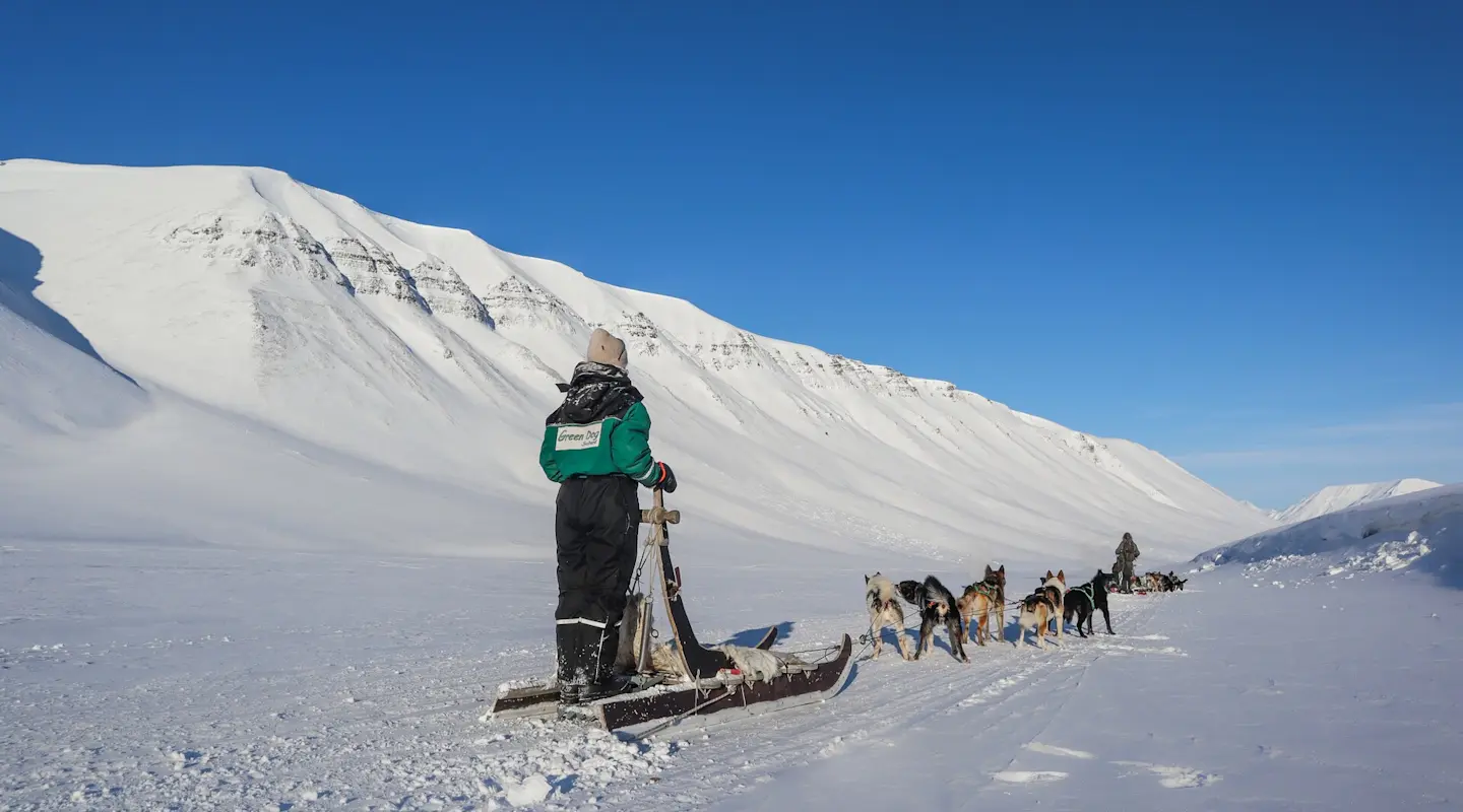 Desayunaremos en el Funken Lodge y luego saldremos a vivir una experiencia polar única conduciendo nosotros mismos un trineo tirado por perros (dos personas por trineo). Durante la excursión nos adentraremos en el valle de Bolterdalen hasta llegar al glaciar Scott Turner, donde daremos la vuelta. Con suerte, durante la actividad quizás veremos alguno de los animales típicos de la región, como renos y zorros árticos e incluso alguna aurora boreal. Almorzaremos y después cogeremos una retrac especialmente diseñada para viajar por terrenos nevados y subiremos hasta el glaciar Longyear, desde donde se disfruta de magníficas vistas de la ciudad. Una vez arriba, nos equiparemos con casco y crampones y exploraremos las espectaculares cuevas de hielo que se forman dentro del glaciar.