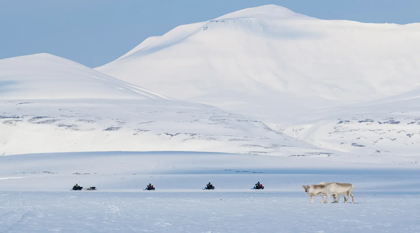 Recorreremos unos 190 kilómetros, atravesando extensas llanuras y sistemas glaciares, y nos sentiremos realmente pequeños en el imponente paisaje de Svalbard. Haremos varias paradas por el camino, y es muy probable que nos crucemos con renos, urogallos de Svalbard o zorros polares.