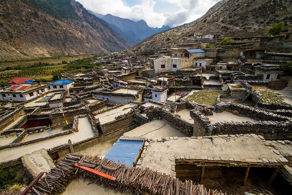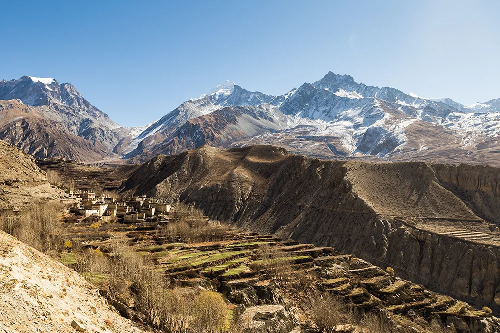 A primera hora del matí tindrem l’opció (no inclòs al preu del viatge) de fer una excursió en helicòpter al camp base de la muntanya de l’Annapurna. L’helicòpter s’enlairarà i farà un espectacular sobrevol de 25 minuts a través de valls exuberants, rius pintorescos i pobles tradicionals. A mesura que va pujant més amunt, l’Himàlaia apareix a la vista, amb perspectives de prop de l’Annapurna, Dhaulagiri i Hiunchuli. En arribar al campament base de l’Annapurna, tindrem aproximadament 15 minuts per meravellar-vos de l’impressionant entorn, fer fotografies i absorbir la bellesa serena d’aquest santuari. A continuació retornarem a Pokhara, després d’haver viscut una increïble experiència. Avui pujarem als vehicles 4×4, que ens acompanyaran fins que retornem a Pokhara. Recorrerem una carretera de muntanya panoràmica, que forma part del famós circuit de l’Annapurna i que ens portarà a conèixer la vall baixa de Mustang. Durant el camí veurem petites poblacions envoltats d’una espectacular natura i ens aturarem a conèixer el temple de Galeshwor. Dinarem a la zona de Tapotani i a la tarda arribarem al nostre lodge de la població de Thasang, on ens allotjarem i soparem tot gaudint d’unes vistes espectaculars sobre les muntanyes Dhaulagiri i Nilgiri.
